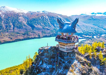 08:30—12:30 早餐后换乘区间车前往观鱼亭,抵达后攀登1068个台阶登上观鱼台,后俯瞰喀纳斯湖全景